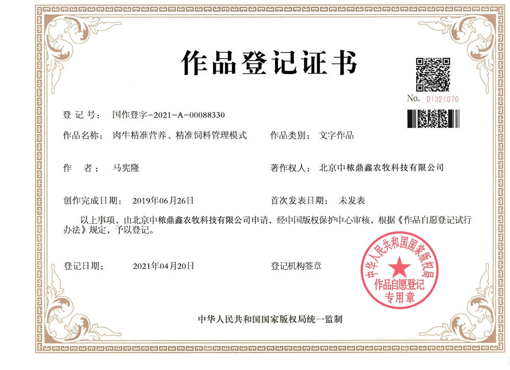 肉牛精準營養版權登記證書